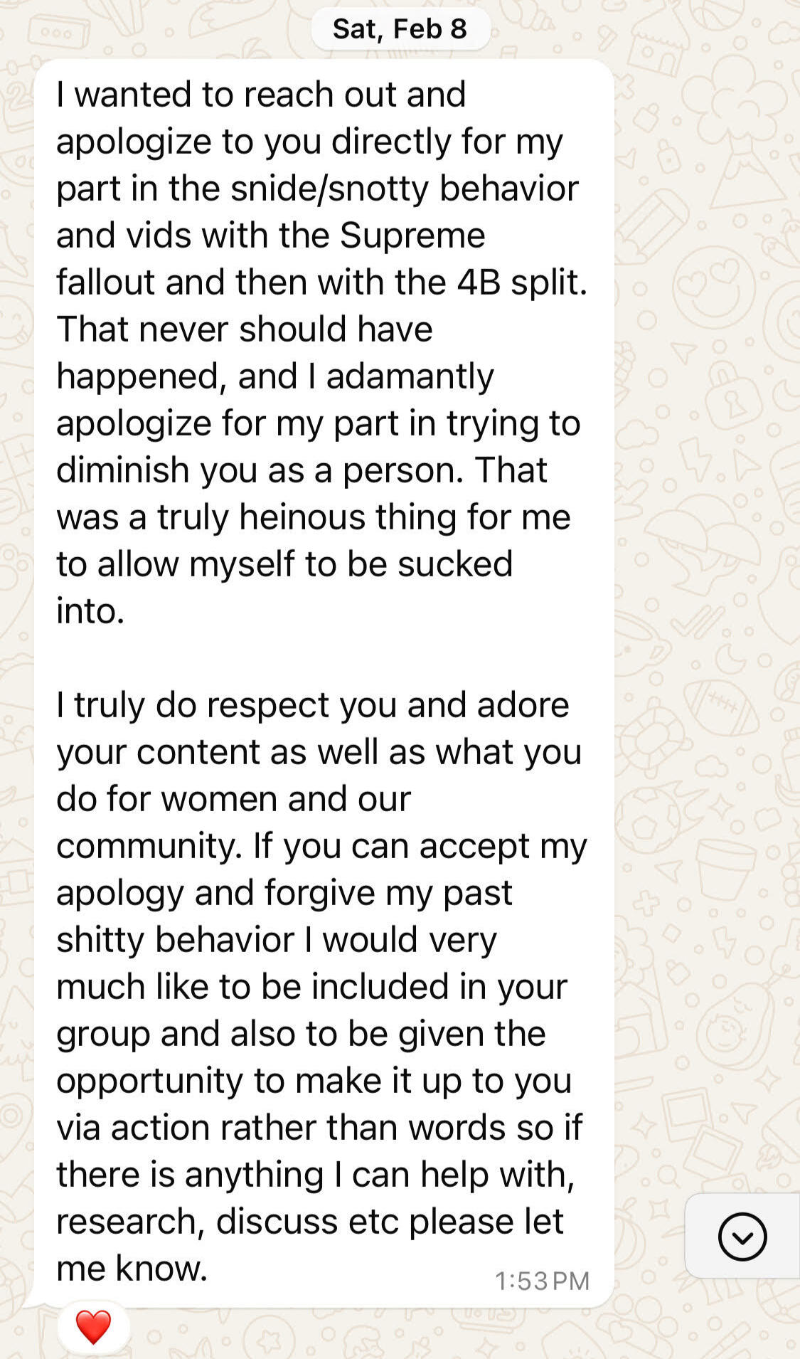 I've been shown that, during the time we severed contact, until now, she's had an ongoing campaign to discredit me, and has encouraged the creation of media and content to disparage my efforts. She regularly monitors my social media, and intentionally fosters drama and division where she sees it can be made. I have blocked her and any of her cult members everywhere online, but they still pursue me.Not long ago, I was contacted by a womin who apologized for taking part in the campaign, apologizing to me for misjudging my character (based on Jennifer's accusations), and looked to join my project.I've been consistently working on projects and events dedicated to addressing sexist disparities in various societies and communities. She saw this, and noticed discrepancies in Jennifer's accusations against me vs my real behaviour.This is that message.
