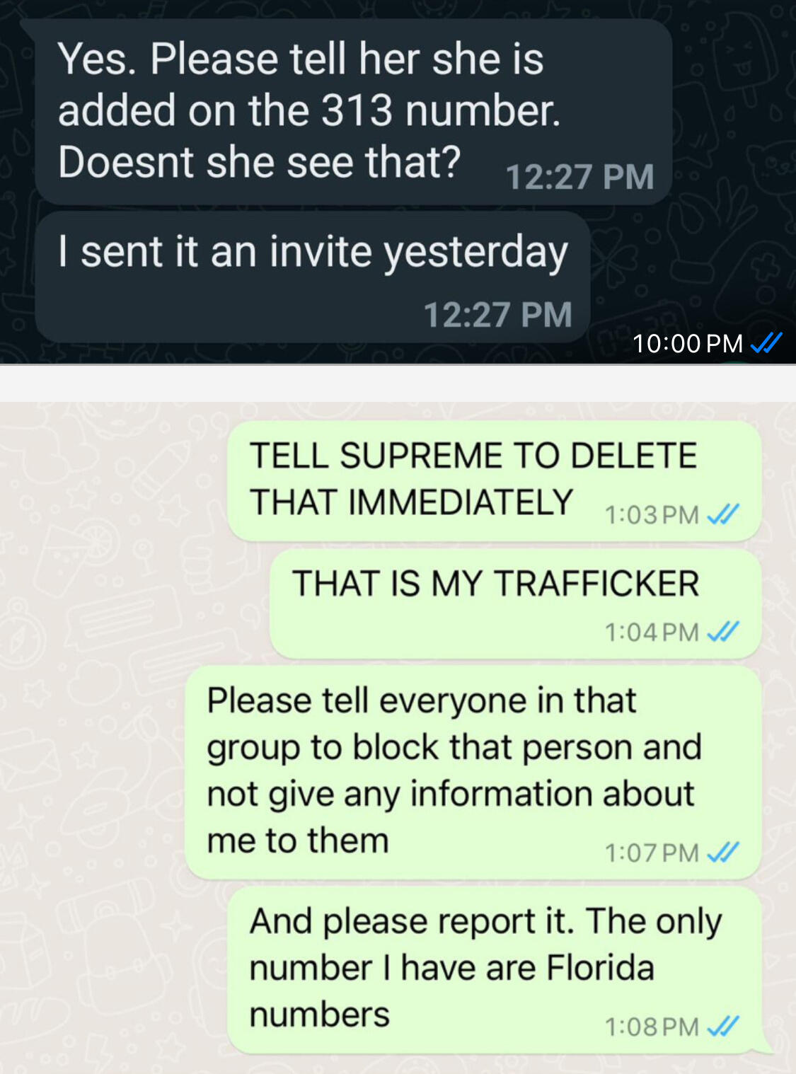 ...for whatever reason. I assumed that this was just another baseless attack from one of her many, many enemies (that she made through mistreating, abusing, and blackmailing people). As it turns out, this was true. Jennifer had removed me from her group once before, and didn't speak for a while until she figured I'd be useful again.After deleting me from the group a second time, and potentially blocking/unblocking (or ignoring) messages from my other account, she added a 313 number, claiming it was me to the group, saying it had my photo.The only account that could exist like that, would be from the pimp "organization" that harmed me. Jennifer searched for information on me, which is the only way she would've come across this information, since I haven't shared that with anyone.This is my accusation against Jennifer. Not that she trafficked me, but through her sick manipulation methods, she invaded my privacy, and indirectly threatened me by letting me know she found information about me that I never shared with her. She will do anything to obscure criticisms of her corrupt character.